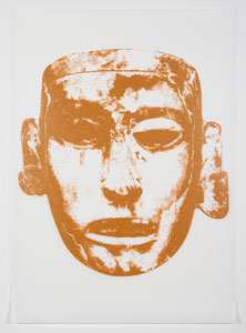 Aztec Mask (Ochre), 2014, hand-painted acrylic on Mylar, 50 x 36 in. |