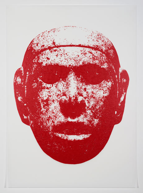 Aztec Mask (Cadmium), 2014, hand-painted acrylic on Mylar, 50 x 36 in. |