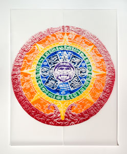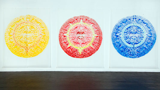 Aztec Calendars, Yellow, Red, Blue, 2008, hand-painted acrylic on Mylar, 3 panels, 90 X 71 in. each |