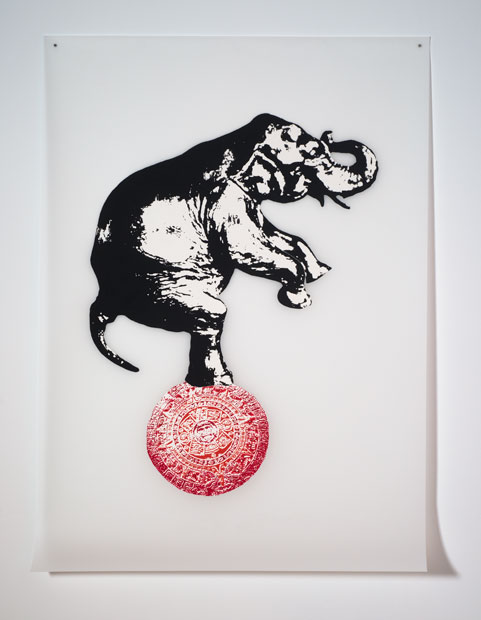 Balancing Act (Red), 2012, hand-painted acrylic and rhinestones on Mylar, 50 x 36 in. |