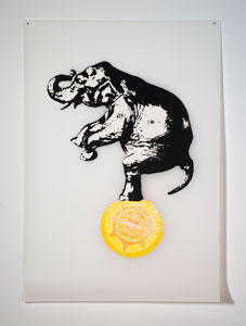 Balancing Act (Yellow), 2012, hand-painted acrylic and rhinestones on Mylar, 50 x 36 in. |