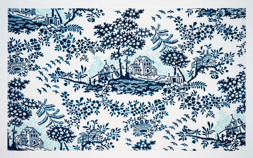 Toile Study (Blue), 2013, hand-painted acrylic on Mylar, 36 x 60 in. |