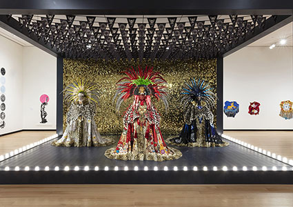 velvet, peau de soie, faux fur, leather, feathers, sequins, beaded trim, taxidermy form, appliques, and rhinestones, installation view at the Wellin Museum of Art, dimensions variable. Photo by John Bentham. |