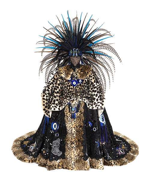 velvet, peau de soie, faux fur, leather, feathers, sequins, beaded trim, taxidermy form, appliques, and rhinestones, approximately 120 x 72 x 120 inches. Photo by John Bentham. |