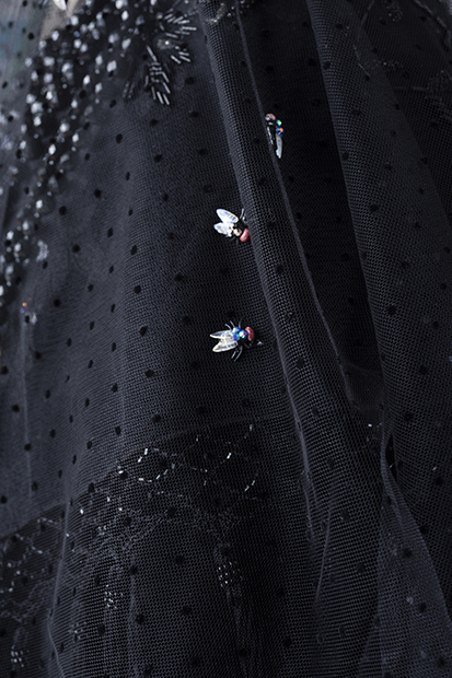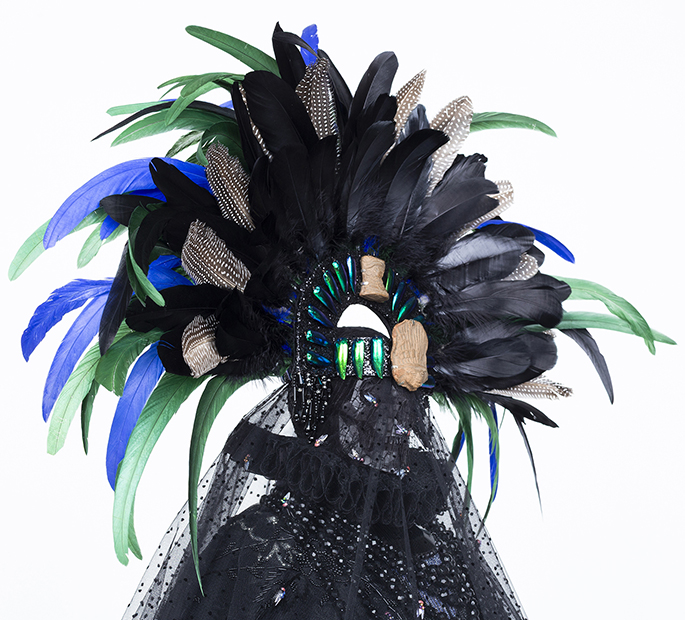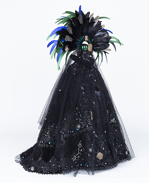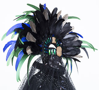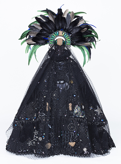 velvet, taffeta, lace, wax, resin, half-scale dress form, sequin appliques, rhinestones, plastic flies, rooster and pheasant feathers, approximately 56 x 40 x 40 inches. Photo by E. Brady Robinson |