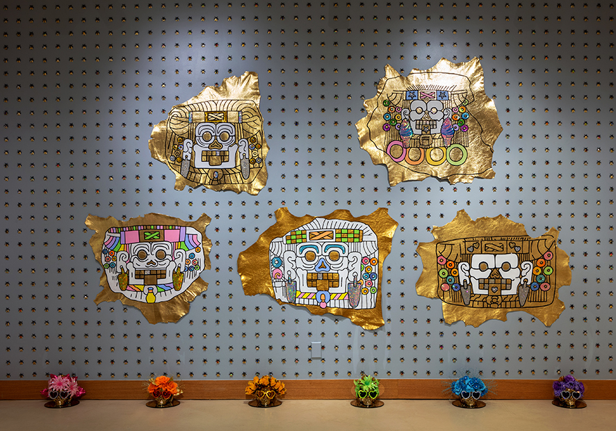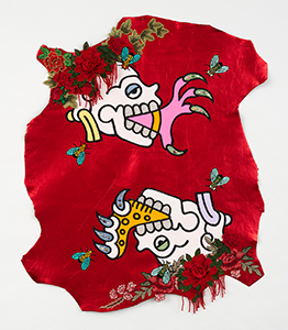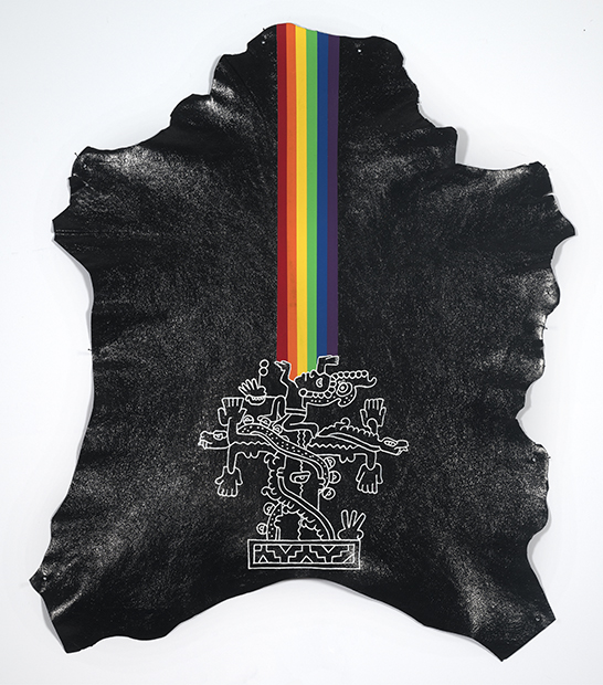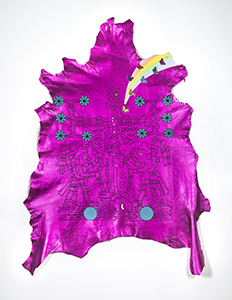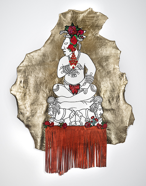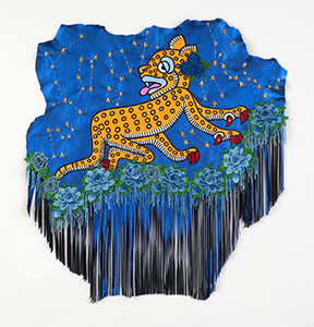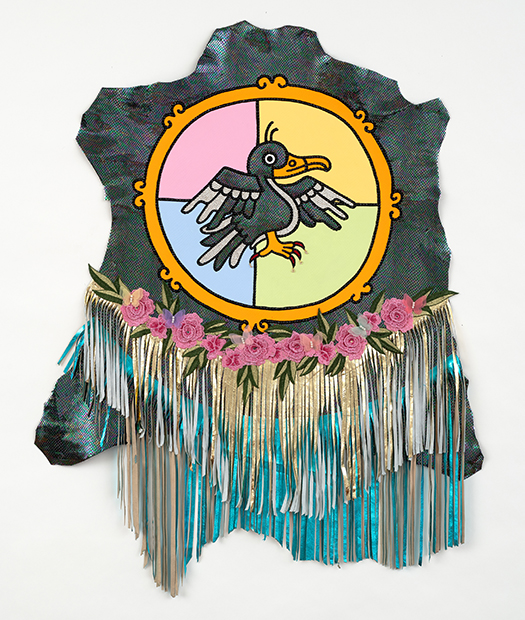 acrylic, embroidered patches, and rhinestones on metallic leather, 35 x 28 in. |
