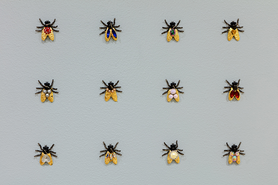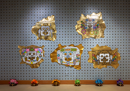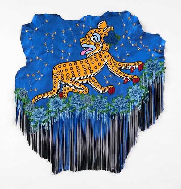 acrylic, embroidered patches, and rhinestones on metallic leather, 41 x 32 in. |
