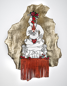 acrylic, embroidered lace and rhinestones on metallic leather, 37 x 28 in. |